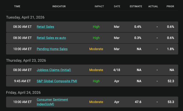 On the calendar, we’ll get Retail Sales, Pending Home Sales, Jobless Claims, and Consumer Sentiment. While these reports can move markets, there are no Treasury auctions scheduled, removing a recent source of upward pressure on yields.