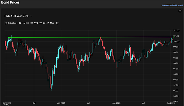 Each candle represents one day of trading. As mortgage bonds prices move higher, rates move lower. You can see on the right side of the chart how Mortgage Bond prices are trading at three-year highs, which means three-year rate lows.